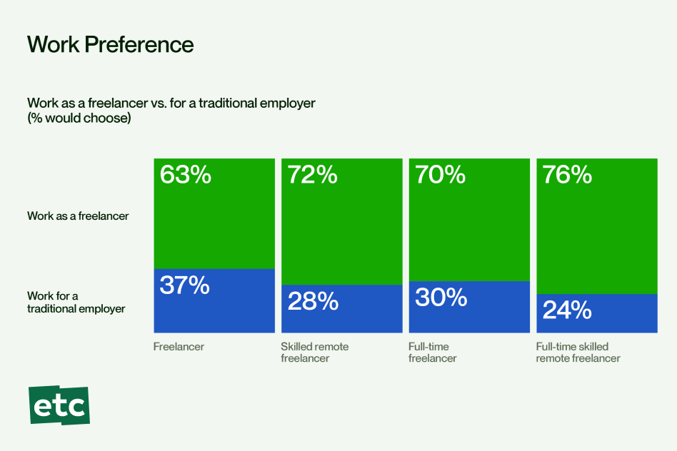 63% of freelancers prefer freelancing over a traditional job. This number rises even higher to 76% for full-time skilled remote freelancers.
